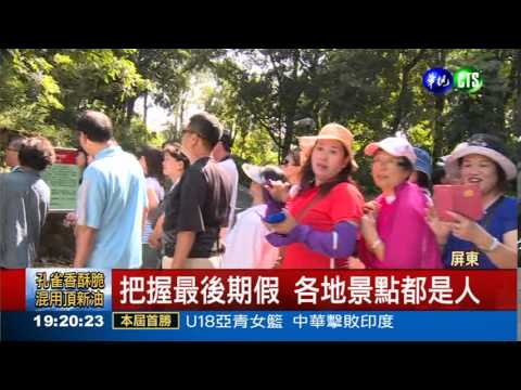 墾丁各處景點也是人山人海。警方估計恆春半島3天來至少湧進5萬輛車次,民宿都被預訂一空。昨天收假,屏南交通瓶頸水底寮五叉路口嚴重堵塞,所幸連假期間並未發生重大車禍。