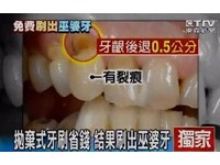 一般人住飯店或旅館都會使用業者附的拋棄式牙刷,有些人乾脆直接帶回家用,省一筆買牙刷的錢。不過一位周先生長期使用這種拋棄式牙刷,結果2、3年下來,發現牙齦萎縮0.5公分,甚至連表面的琺瑯質都磨壞了,牙齒變的尖尖的像巫婆一樣,原來這類牙刷通常刷毛硬,加上刷牙太用力,造成牙齒永久損傷。 《詳全文...》